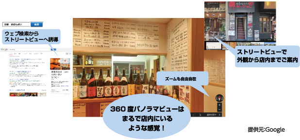 ストリートビューの一番の魅力は室内を360°のパノラマで見渡せること。ネット上から手軽に内部を見ることができ、まるで店内にいるように雰囲気を伝えます。